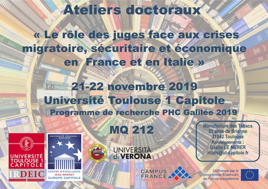 Dans le cadre et avec le soutien du programme de recherche PHC Galilée 2019, les équipes de l’Université Toulouse I Capitole et de l’Université de Vérone organisent des ateliers doctoraux les 21 et 22 novembre 2019 sur le thème : « Le rôle des juges face aux crises migratoire, sécuritaire et économique en France et en Italie ».