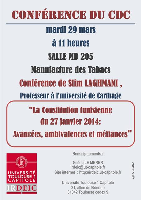 "La Constitution tunisienne du 27 janvier 2014 : Avancées, ambivalences et méfiances, Conférence du Professeur invité Slim LAGHMANI , organisée par le Centre de Droit Comparé de l'IRDEIC