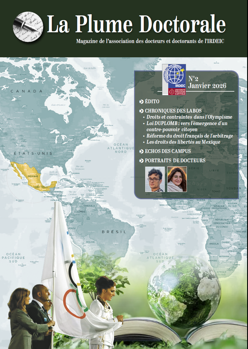 La Plume Doctorale est un journal destiné à valoriser les doctorants et leurs travaux. Il se veut un espace fédérateur rassemblant l’ensemble des doctorants de l’École doctorale de Droit et de Sciences Politiques de l’Université Toulouse Capitole autour d’un projet éditorial commun.