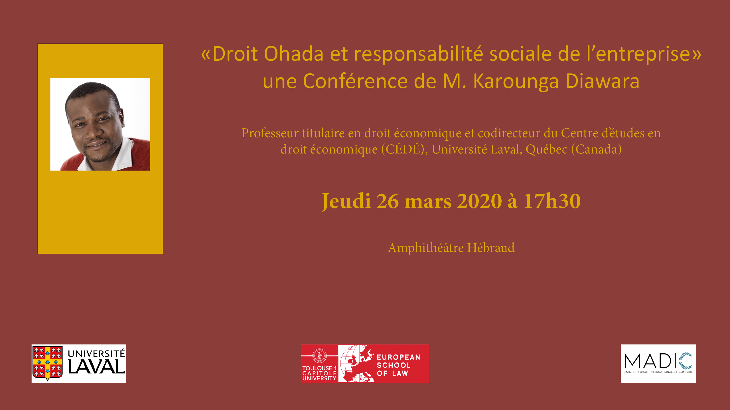 Karounga Diawara, professeur titulaire en droit économique et codirecteur du Centre d’études en droit économique (CÉDÉ) à l'Université Laval au Québec (Canada), interviendra le jeudi 26 mars à 17h30 sur le "Droit Ohada et responsabilité sociale de l'entreprise".
