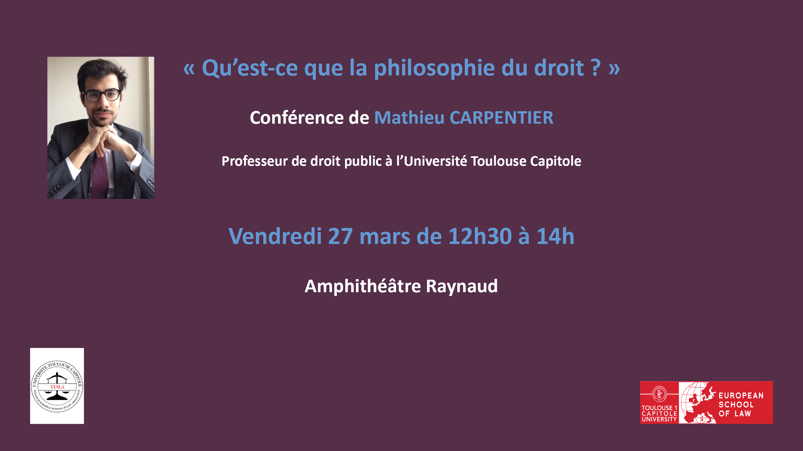 La European School of Law Toulouse, en partenariat avec l'Association des étudiants de l'école (TESLA), a le plaisir d'inviter Mathieu Carpentier, professeur de droit public à l'Université Toulouse Capitole et agrégé de droit et de philosophie, pour une conférence sur "Qu'est-ce que la philosophie du droit ?", le vendredi 27 mars de 12h30 à 14h à l'amphithéâtre Raynaud.