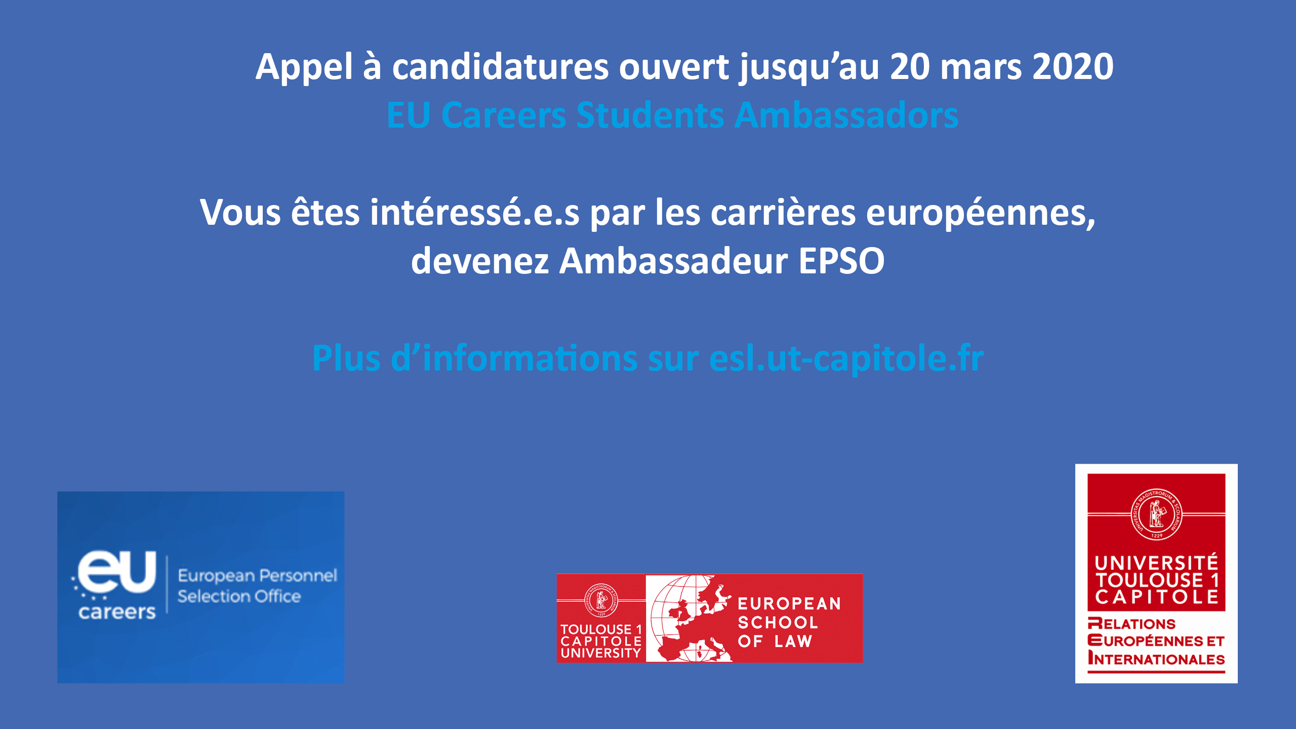 Application for EU Careers Students Ambassadors is open till March, 20 2020 / L'appel à candidatures pour devenir Ambassadeur EPSO (carrières européennes) d'UT1, est ouvert jusqu'au 20 mars 2020.