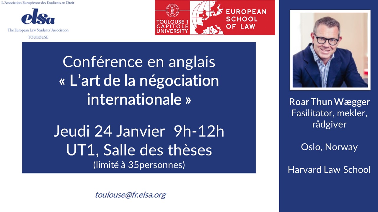 M. Roar Thun Wægger, diplômé de la Harvard Law School, interviendra le jeudi 24 janvier 2019 de 9h à 12h à la salle des thèses, autour de "L'art de la négociation internationale" (conférence en anglais), sur invitation d'ELSA Toulouse.