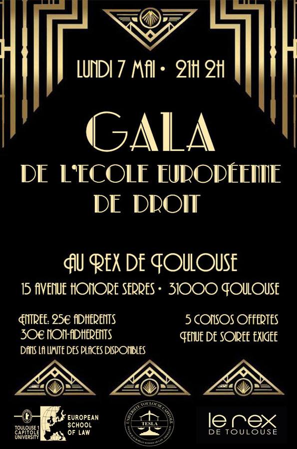 La TESLA organise le GALA de fin d'année de l'European School of Law, à la salle de spectacle du Rex le lundi 7 mai de 21 heures à 2 heures du matin