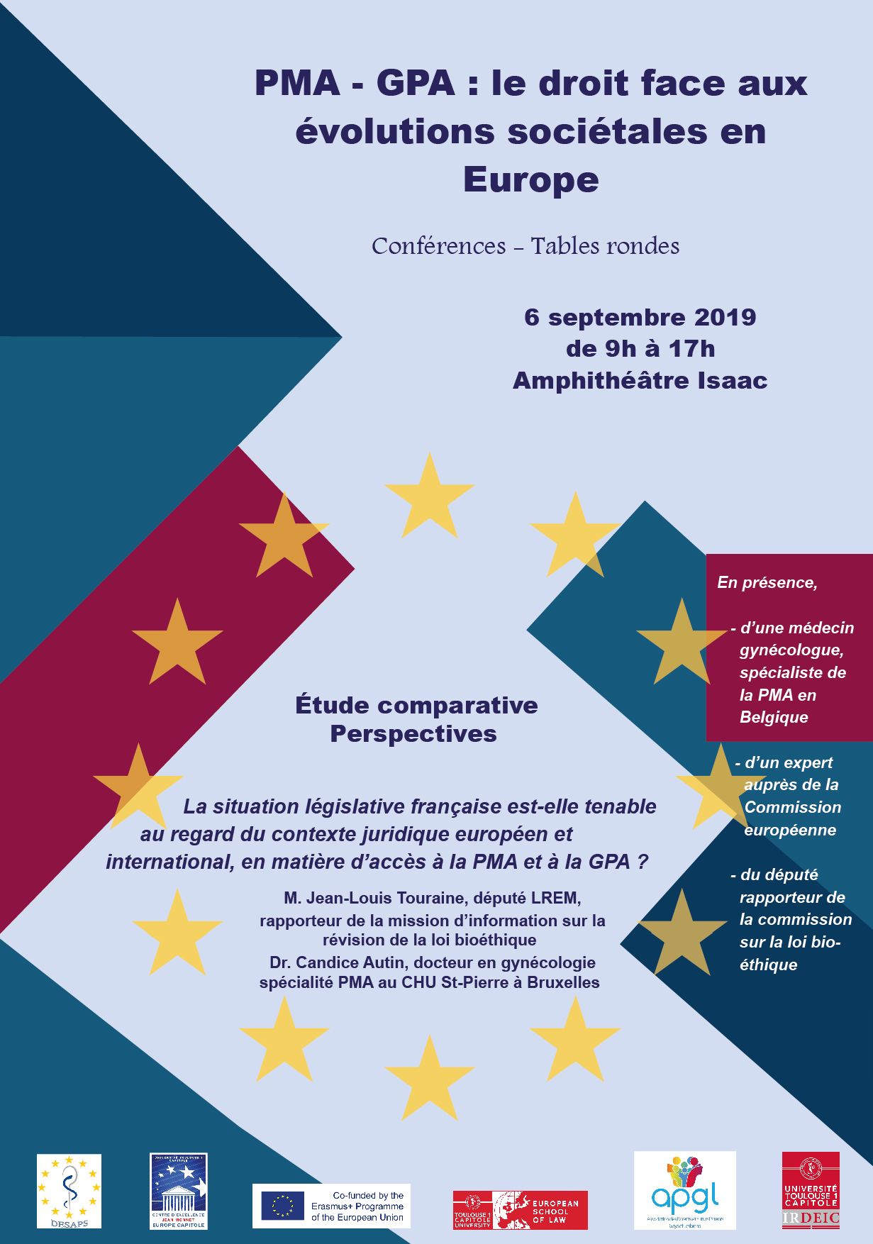 Cet événement a pour but de réunir différents acteurs, issus de milieux professionnels différents, tant médical que juridique et politique, mais aussi issus de la société civile, confrontés à des législations européennes diverses afin de réfléchir sur le système français dans ce contexte législatif européen non unifié sur la PMA et la GPA.