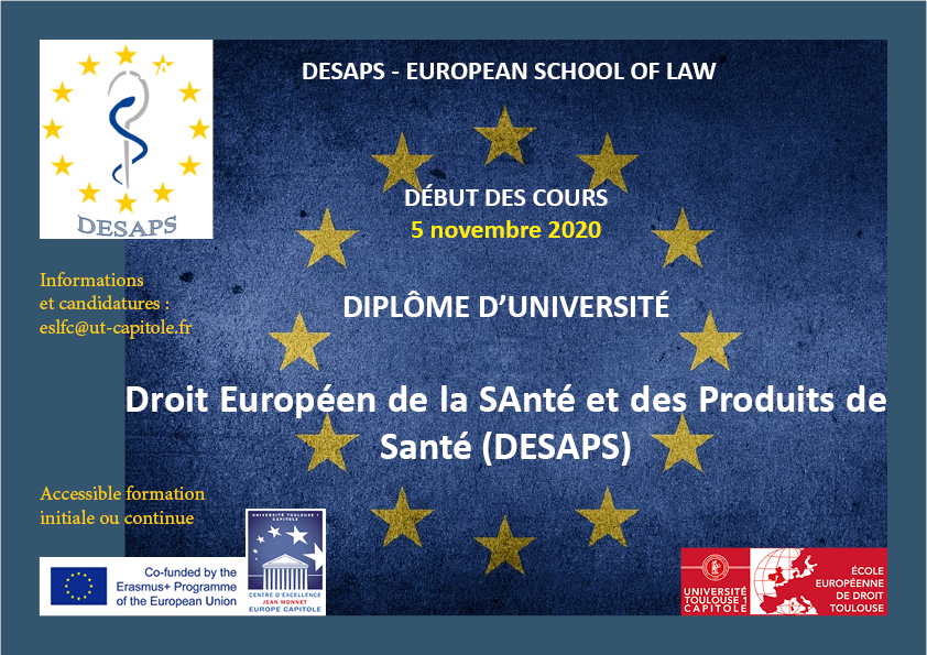 Le Diplôme d’université en droit européen de la santé et des produits de santé (DESAPS) est une formation complémentaire des formations générales proposées à l’Université Toulouse Capitole. Il relève à l'origine des actions de la Chaire Jean Monnet en Droit européen de la santé et des produits de santé dont Nathalie de Grove-Valdeyron est titulaire.