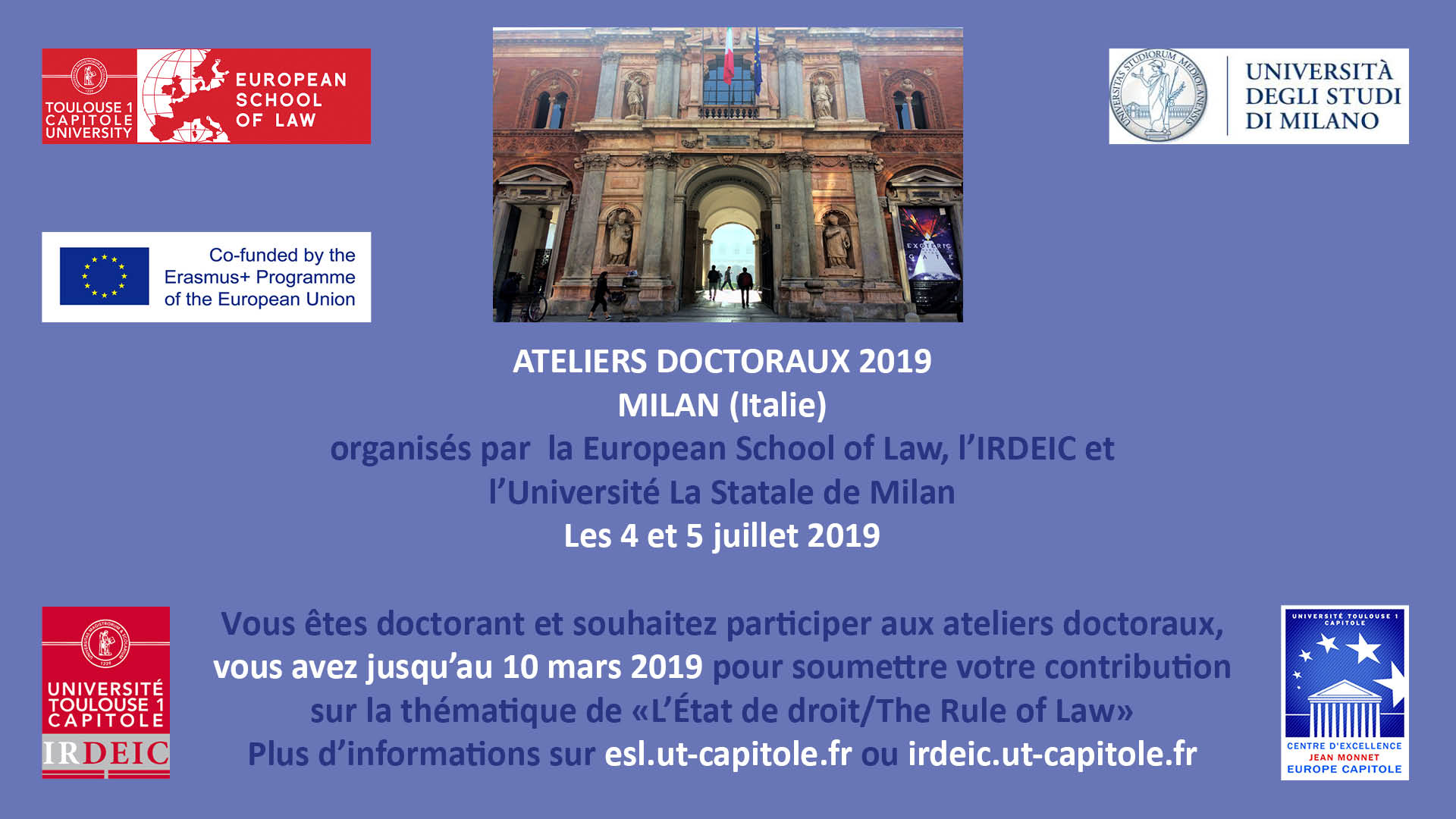 La European School of Law et l'IRDEIC remercient vivement l'Università degli Studi di Milano pour la qualité de son accueil et de son organisation, ainsi que la Commision européenne qui, par l'intermédiaire du Centre d'excellence Jean Monnet, co-finance cette manifestation.